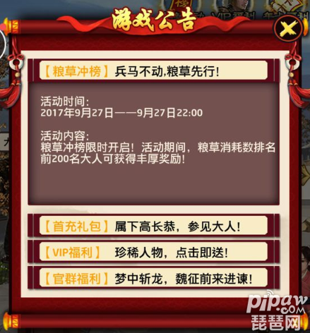 另外我们还需要快速获得大量的粮食,不然只是消耗而没有获得粮食是没办法获得更高的排名了,这时候可以通过提升门客的政治来增加粮食的产量。当然你也可以消耗一些元宝来购买粮食,这样子在消耗的同时也能源源不断或者粮食,取得比较好的排名也比较轻松一些。