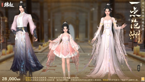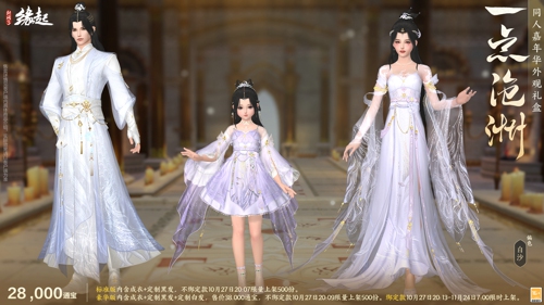 标准版礼盒内含成衣+定制黑发,售价28,000通宝,不绑定款10月27日20:07限量上架500份。