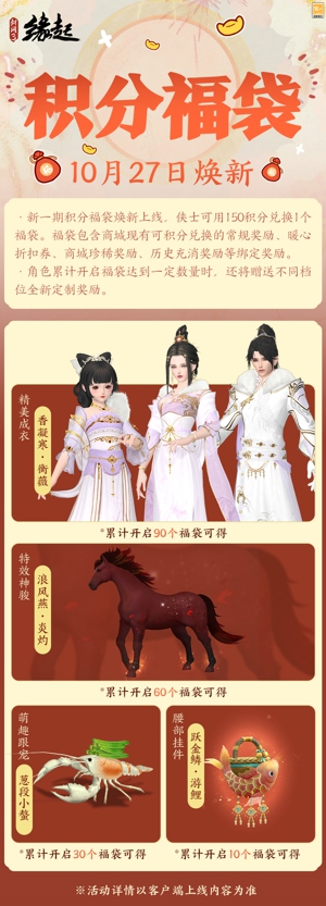更有三倍积分回馈同步开启,10月27日7:00至11月11日24:00,侠士在全区服消耗通宝购买绑定商品,或购买并实装不绑定商品时,立享300%积分回馈,积分累积更快,兑换好物更轻松!