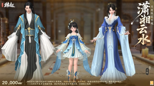 云生潇湘水接天,衣袂翩跹似流烟。月度限定外装「潇湘云水」踏云而至。外装新增千帆、清鹏偏色,尽显雅致风韵,成男、成女、萝莉款各有千秋,将山水灵秀与服饰之美巧妙融合。