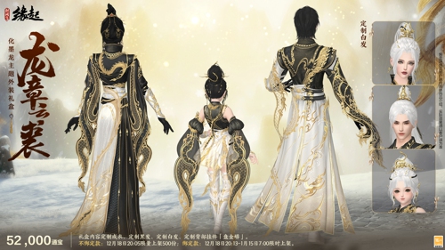 琼霰漫天舞,临妆映镜光。岁末将至,精彩不断,12月18日全新外观即将上架商城,为寒冬增添一份靓色!全新化墨龙主题外观礼盒「龙章云裘」以玄、素、灿金三色,绘新岁之象;外装礼盒「吉祥颂」以民族风搭配为侠士增添暖意;月度限定外观「墨韵青髓」2款全新偏色携6款经典偏色描绘丹青画魂;更有精美头饰及眼饰为侠士的搭配添彩。月度充消同步更新,三倍积分活动惊喜不断!