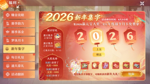 新年启程,相聚新区!等你相聚,新服福利,必得2026元宝!更有开年大奖——年度月卡、年度战令、神兽巳蛇随机掉落!上交5次必得极品坐骑!上交10次必得2026元宝!